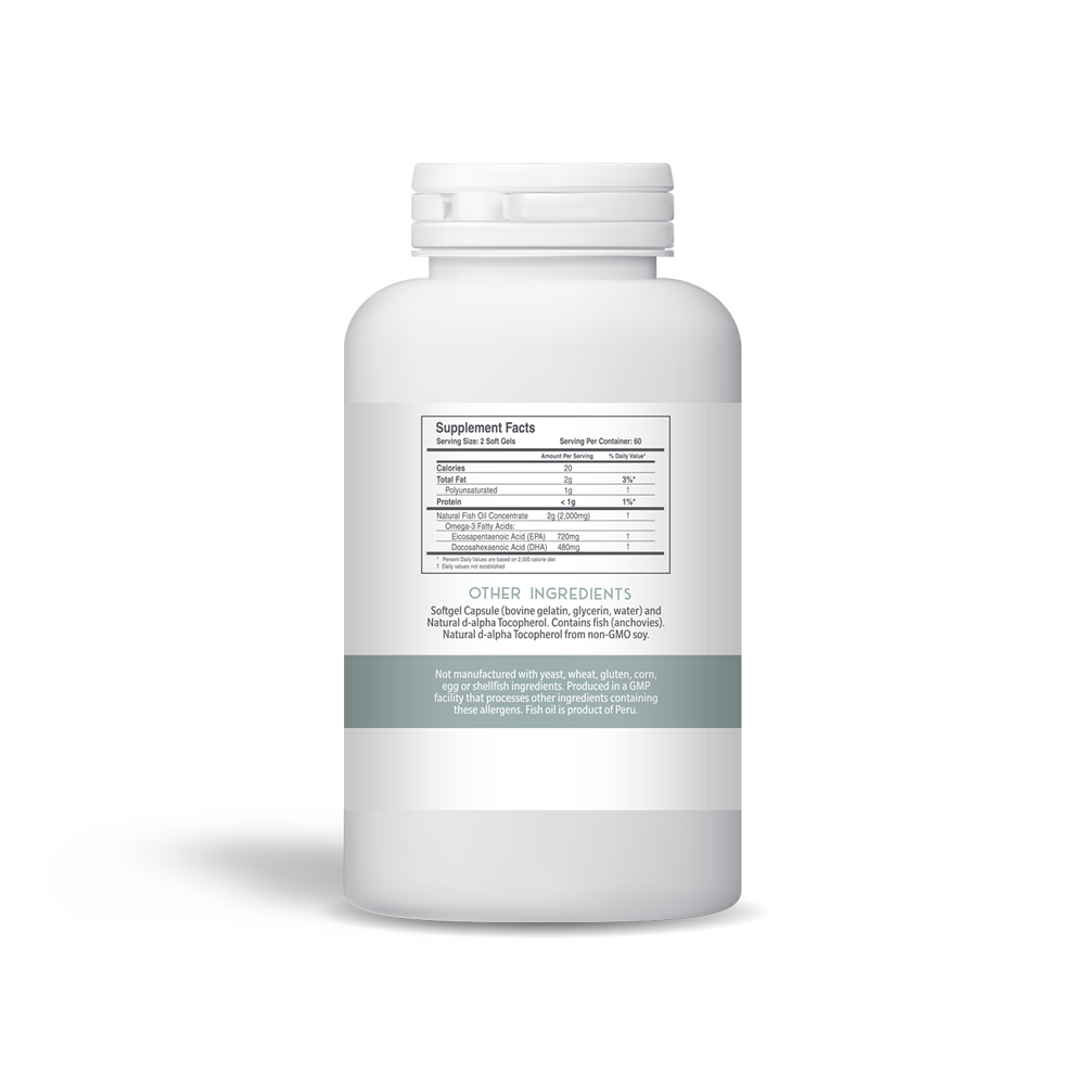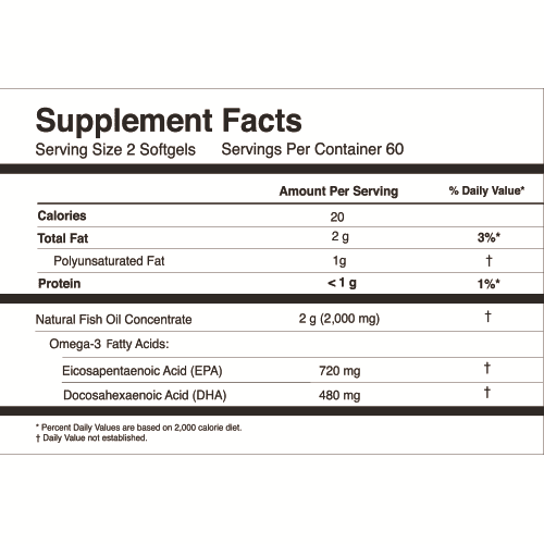 Ingredients: 2000 mg Natural Fish Oil Concentrate, 720 mg EPA, 480 mg DHA